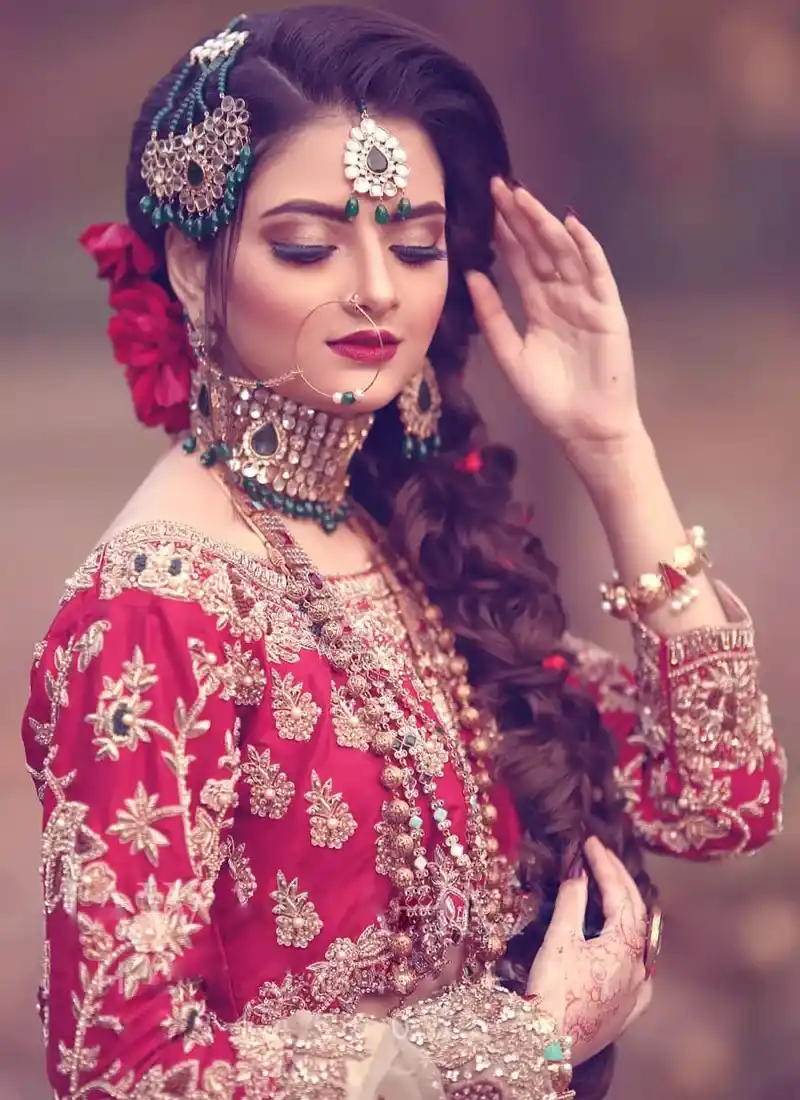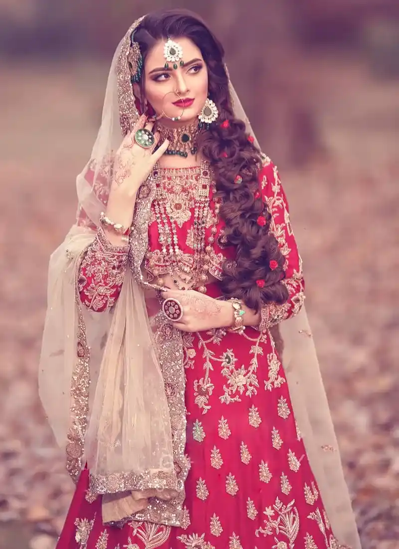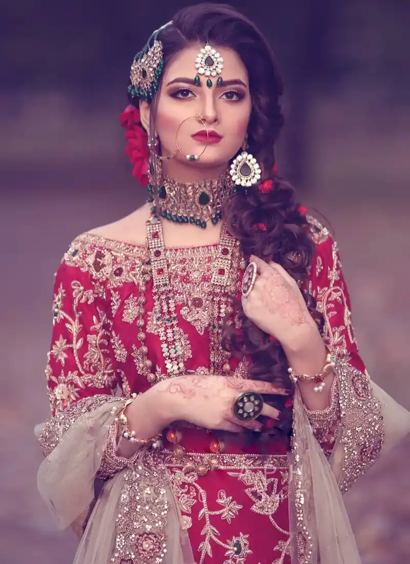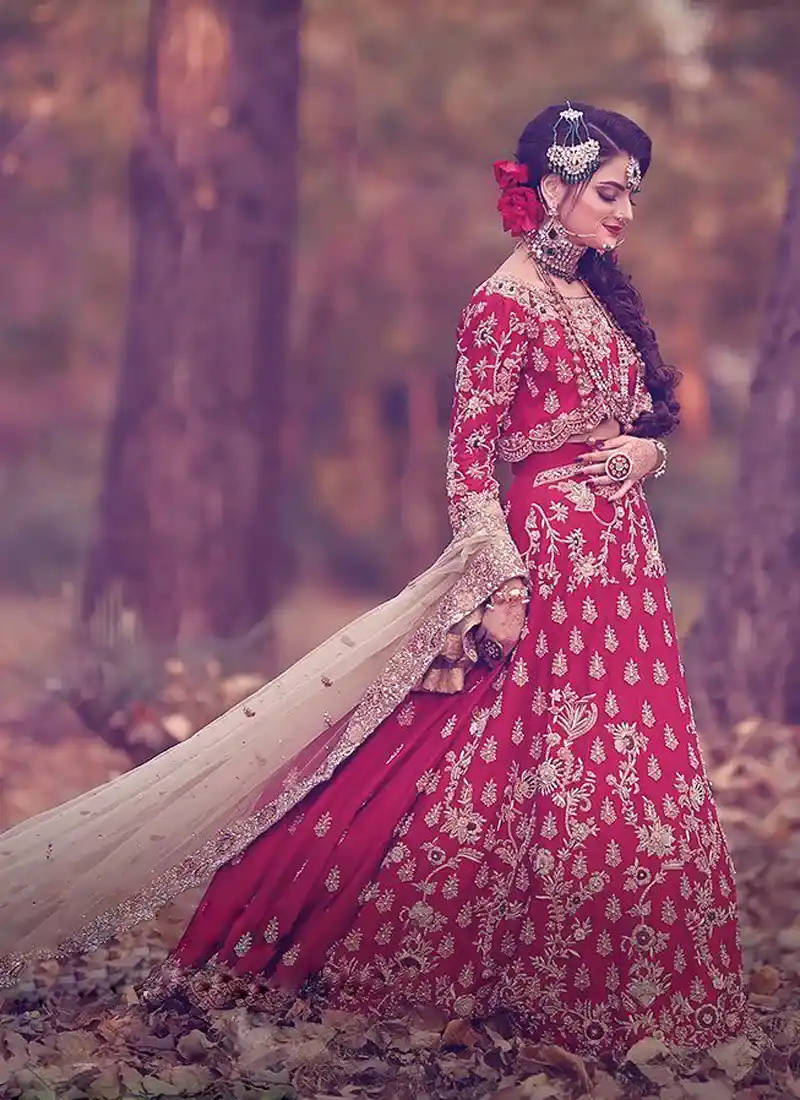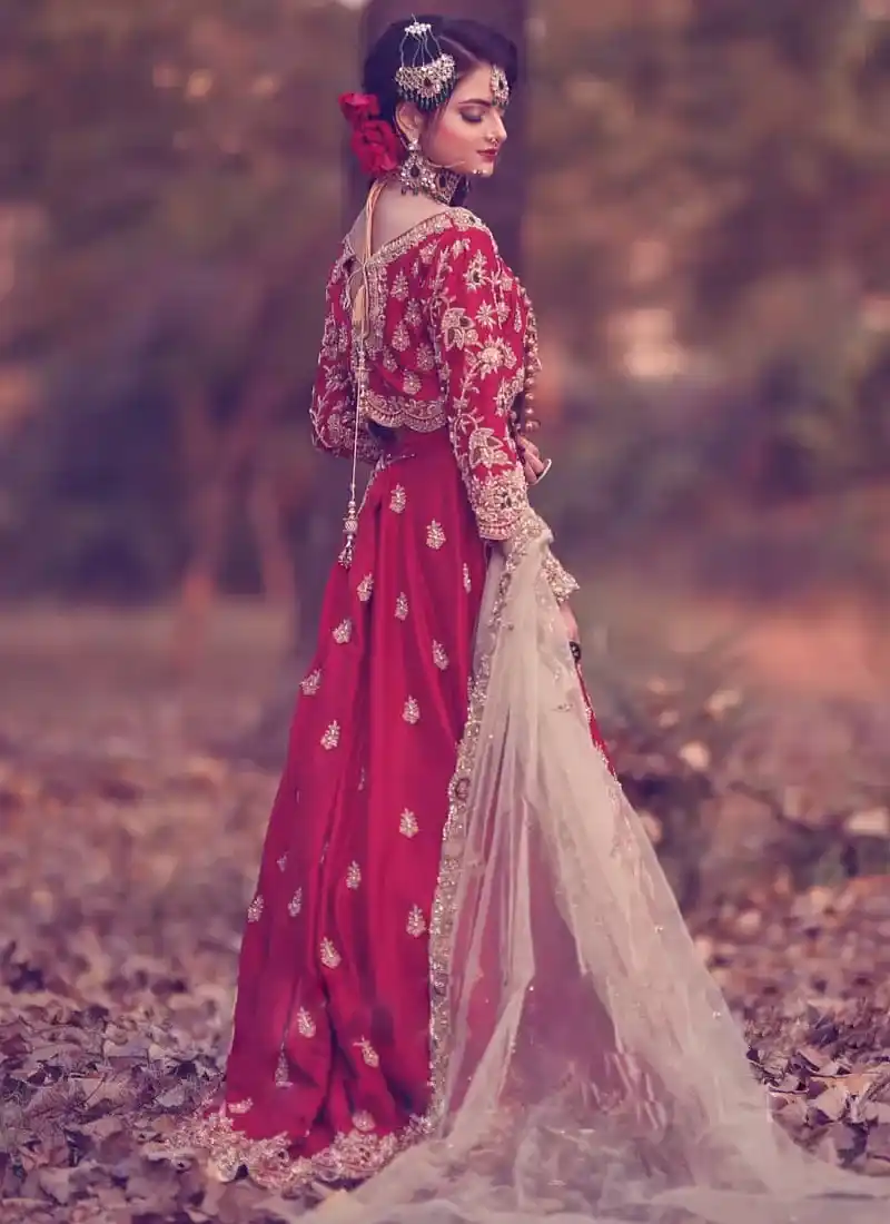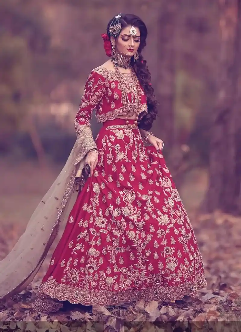 A simple red festive dress might not seem like much, but the perfectly embellished bridal lehenga choli can be a cure-all for wedding-style problems. This flowy, lightweight, yet stylish bridal lehenga floats elegantly upon every step, ideal for brides who love traditional couture with a modern twist.