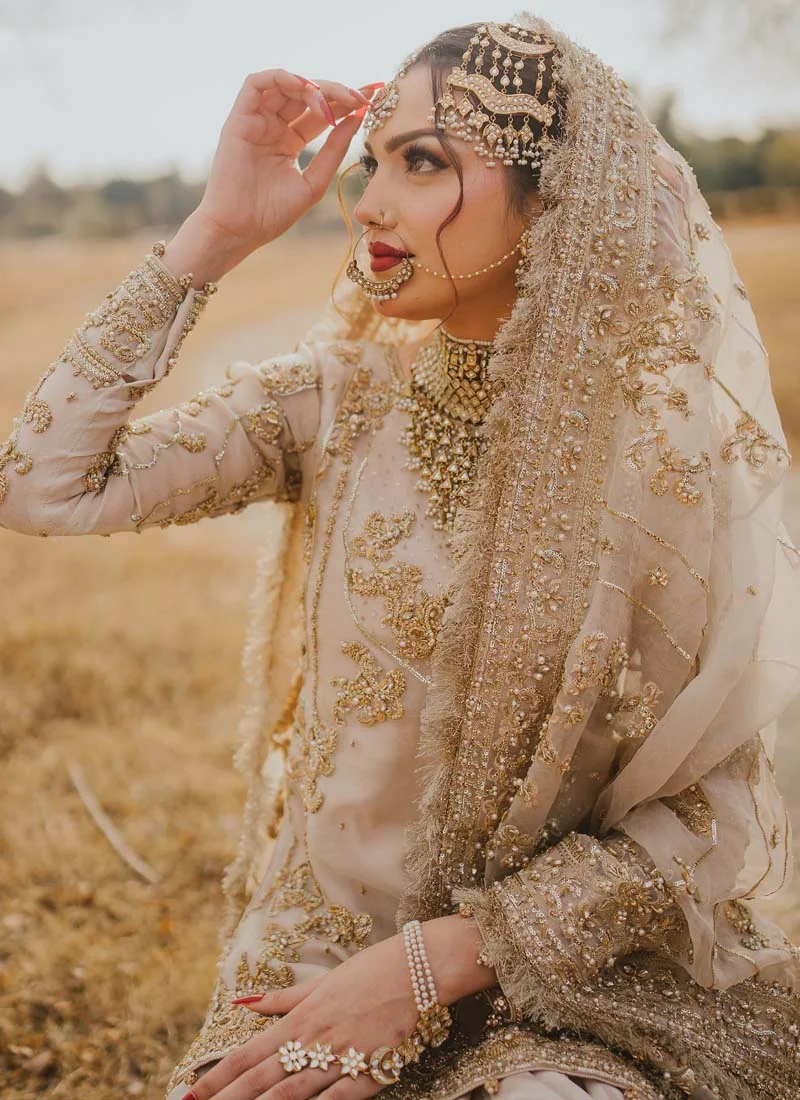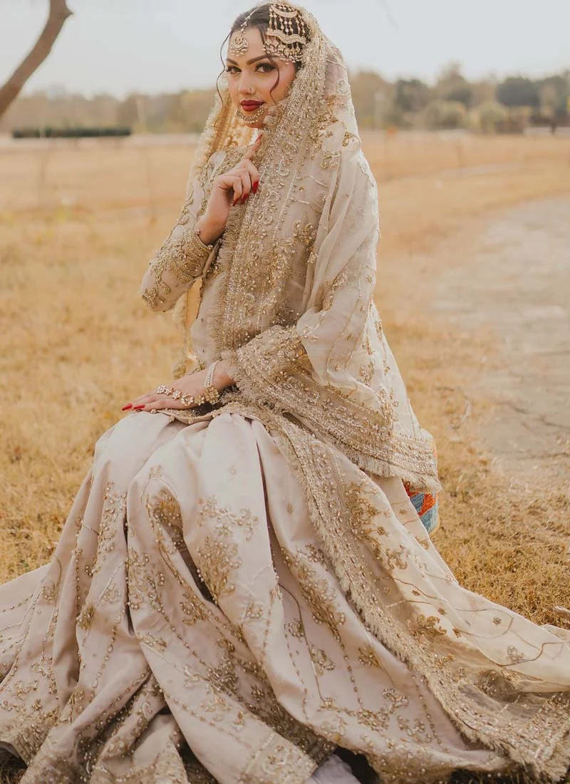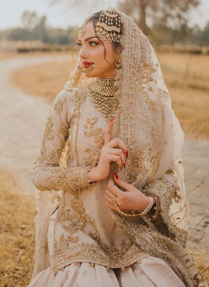 Brownish shade is one of the unique hues in the Pakistani bridal industry. Although it doesn’t have millions of fan following, like pastel pinks and off-whites, there are girls who want to opt for something unique, something classy. At Shadi Dress, we never miss a chance to incorporate a dress into our bridal wear catalogue if we think it’s a worthy outfit. Here is our unique addition—Light Brown Bridal Gharara. The dress is as unique as you’re!