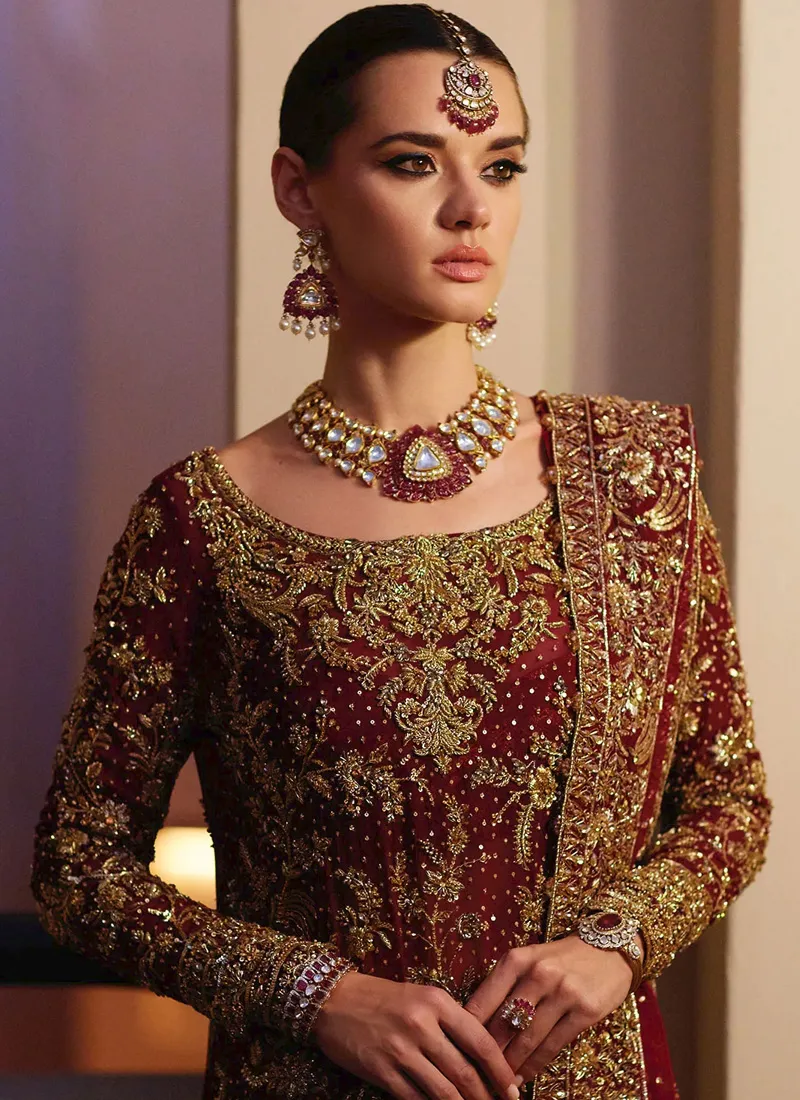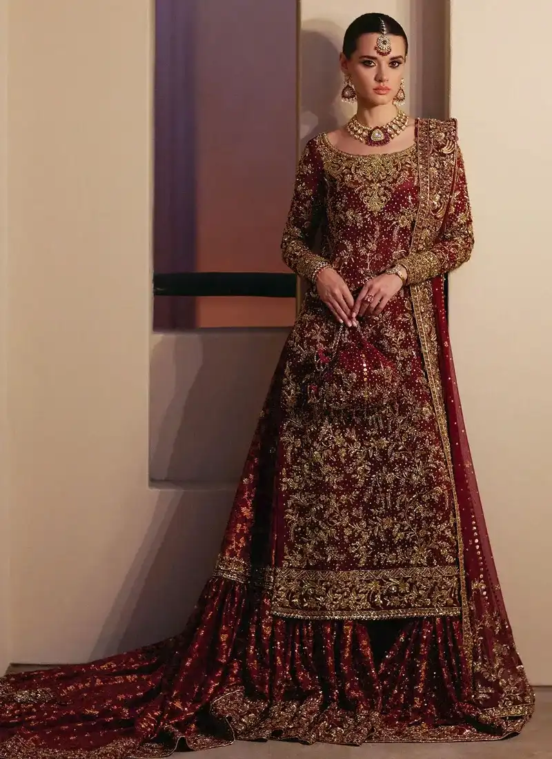 Features of Deep Red Bridal Gharara Dress:
